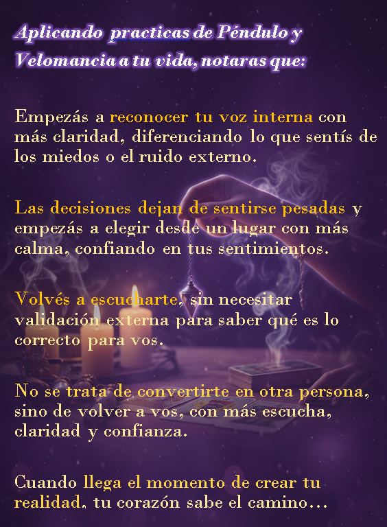 A través de este curso grabado y guiado de péndulo y la velomancia, vas a desarrollar tu intuición, tu confianza y tu conciencia. Podrás incorporar estas herramientas de forma clara y profunda, incluso si estás dando tus primeros pasos. Todo explicado desde cero.